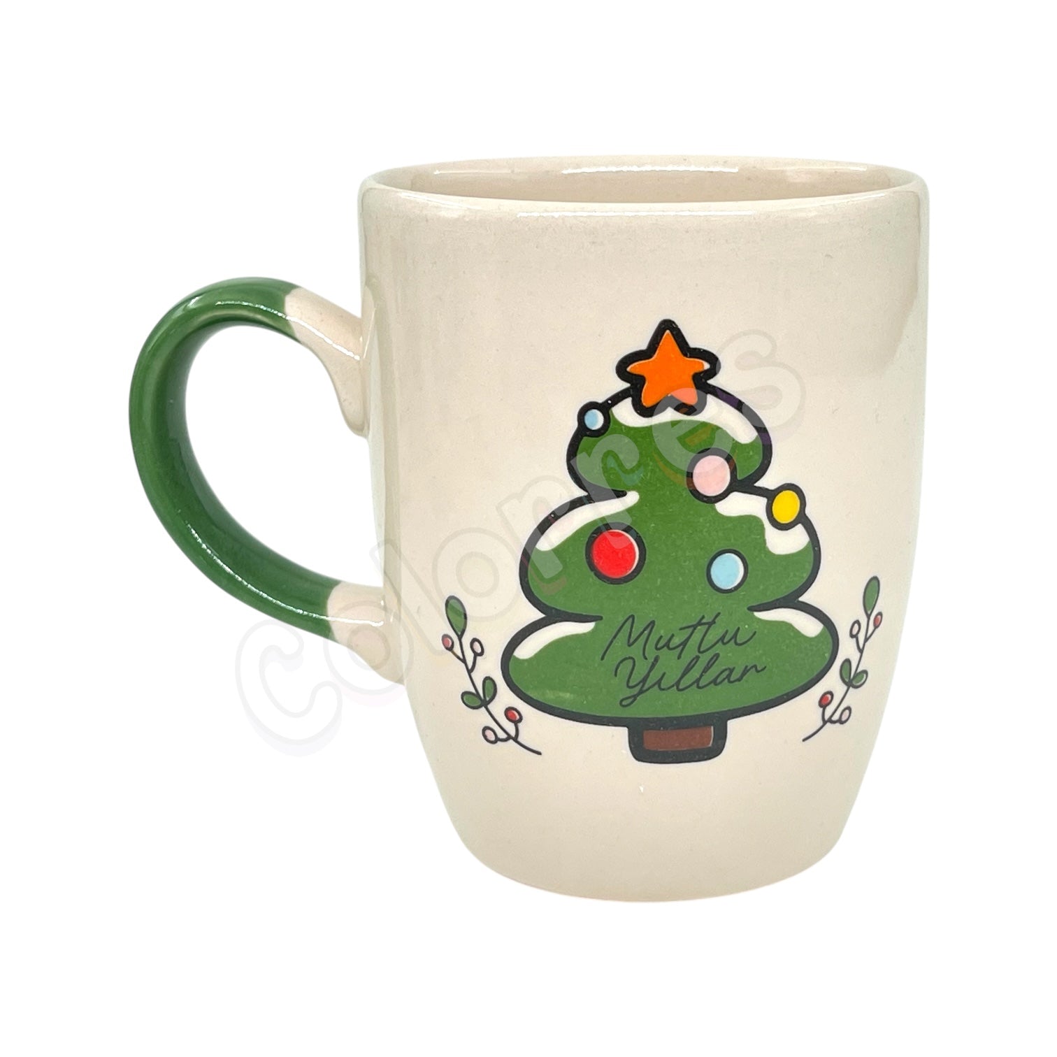 Çam Ağacı Mutlu Yıllar - Yeşil Kulplu Oval Krem Kupa