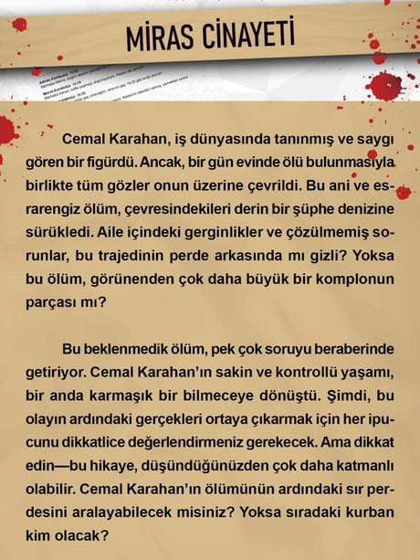 Bu beklenmedik ölüm, pek çok soruyu beraberinde getiriyor. Cemal Karahan'ın sakin ve kontrollü yaşamı, bir anda karmaşık bir bilmeceye dönüştü. Şimdi, bu olayın ardındaki gerçekleri ortaya çıkarmak için her ipucunu dikkatlice değerlendirmeniz gerekecek. Ama dikkat edin - bu hikaye, düşündüğünüzden çok daha katmanlı olabilir. Cemal Karahan'ın ölümünün ardındaki sır perdesini aralayabilecek misiniz? Yoksa sıradaki kurban kim olacak?