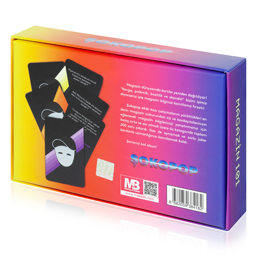 Kavga, polemik, basitlik, skandal...Hepsi bir kutuda bir araya geldi! Şokopop ekibi, siz ve kankeytolarınızın eğlenerek magazin bilgilerinizi yarıştırmanız için kolay, orta ve zor olmak üzere toplam 200 soru çıkardı. Size de oynamak ve sürpriz joker kartlarla uzmanlığınızı kanıtlamak kaldı. Şansınız bol olsun!